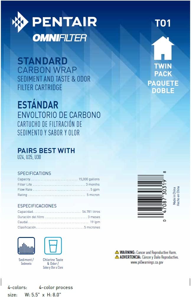 The OMNIFilter Pentair TO1 Carbon Water Filter 10-Inch Cartridge is a reliable, economical solution for whole house water filtration, providing cleaner, clearer, and better-tasting water for your home. This dual-purpose filter, crafted with carbon-impregnated cellulose and durable netting, efficiently removes fine sediment, rust, and chlorine taste and odor. Compatible with standard 10" housings and offering a generous 15,000-gallon capacity, it ensures lasting performance. Ideal for use with chlorinated water supplies, this Pack of 2 replacement cartridges from the OMNIFilter Store makes maintaining fresh, high-quality tap water simple and cost-effective.
