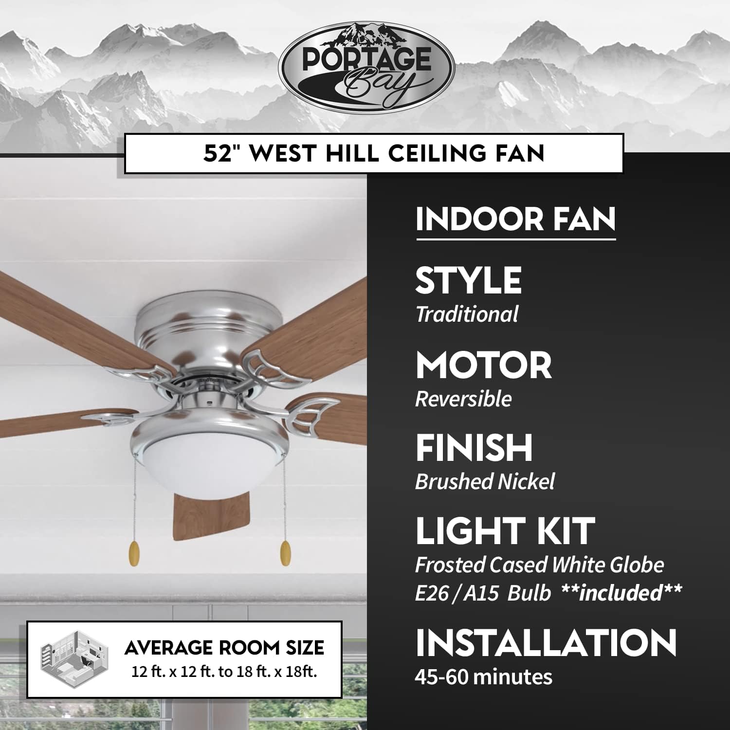 - Portage Bay build quality: Rugged brushed nickel finish, limited lifetime warranty, and easy-to-use pull chains.