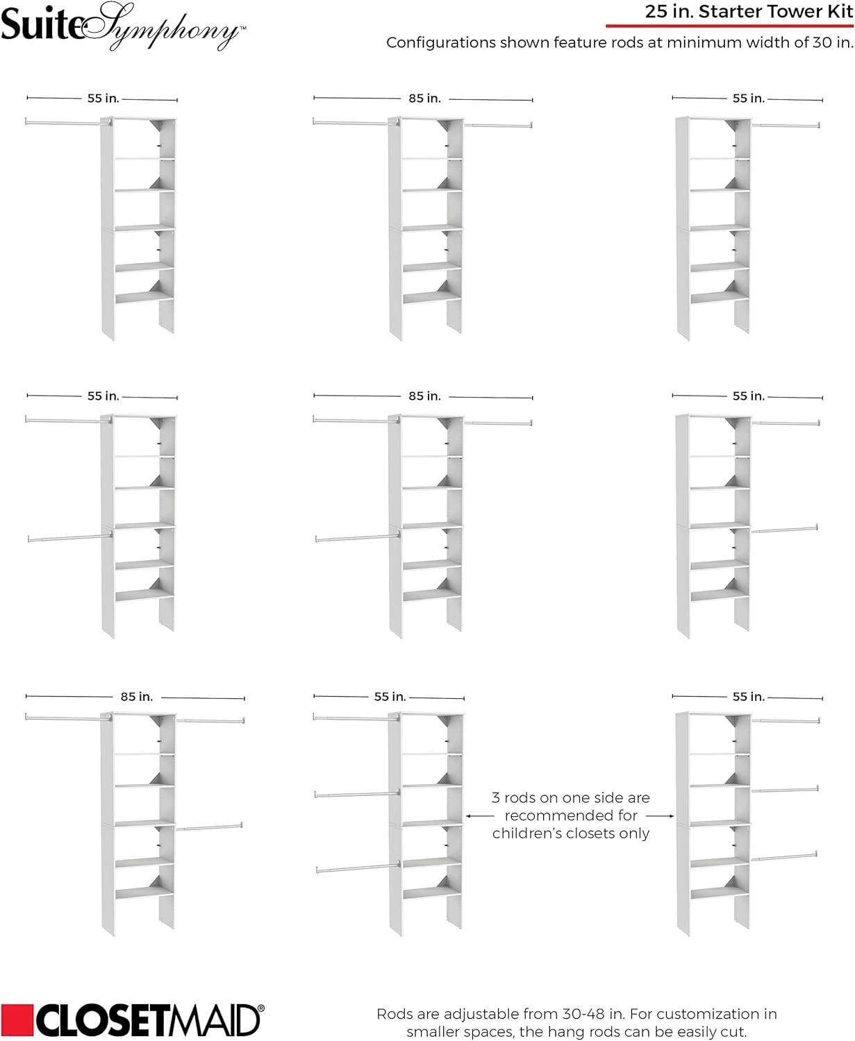 Transform your storage space with the ClosetMaid SuiteSymphony Wood Closet Organizer System, a versatile starter kit featuring adjustable shelves, three expandable hang rods, and a customizable tower. Perfect for reach-in or walk-in closets between 5 to 10 feet wide, this all-in-one system from ClosetMaid offers flexibility to suit any home organization need. Expand your setup with compatible add-on units or use the sturdy shelving alone for organizing clothes, shoes, and more. Easy to assemble with all hardware included, it's an ideal solution for creating a stylish, functional closet makeover.
