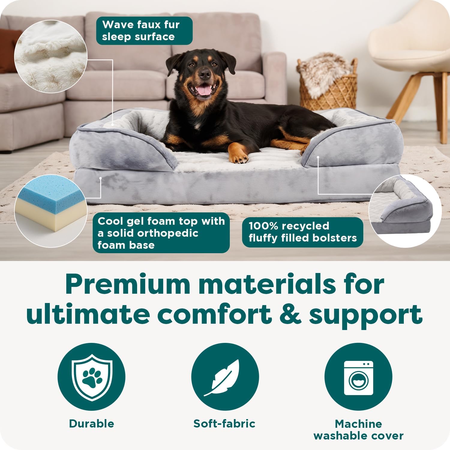 - Easy-to-Clean, Durable Materials: Thanks to a zippered, removable cover, this model is fully machine washable. Crafted with CertiPUR-US certified foam, it’s free from harmful chemicals and built to resist daily wear and tear often seen with large breeds.