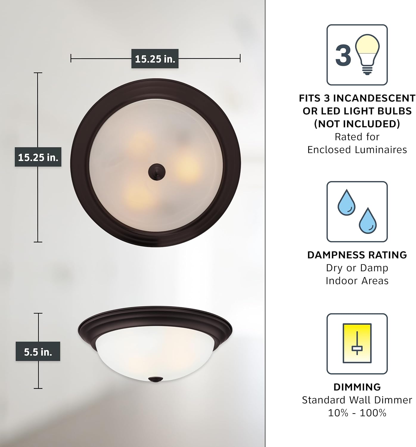 Upgrade your home lighting with the DESIGNERS FOUNTAIN Reedley 3-Lights Flush Mount Ceiling Light, a sleek and modern fixture perfect for kitchens, bedrooms, bathrooms, and more. Featuring a durable steel build with an elegant oil rubbed bronze finish and etched glass shade, this 15-inch fixture provides soft, sophisticated illumination. Easy to install and compatible with standard dimmers, it promises lasting quality and versatile style across any indoor space. Elevate your décor with this reliable and stylish ceiling light from a trusted brand.