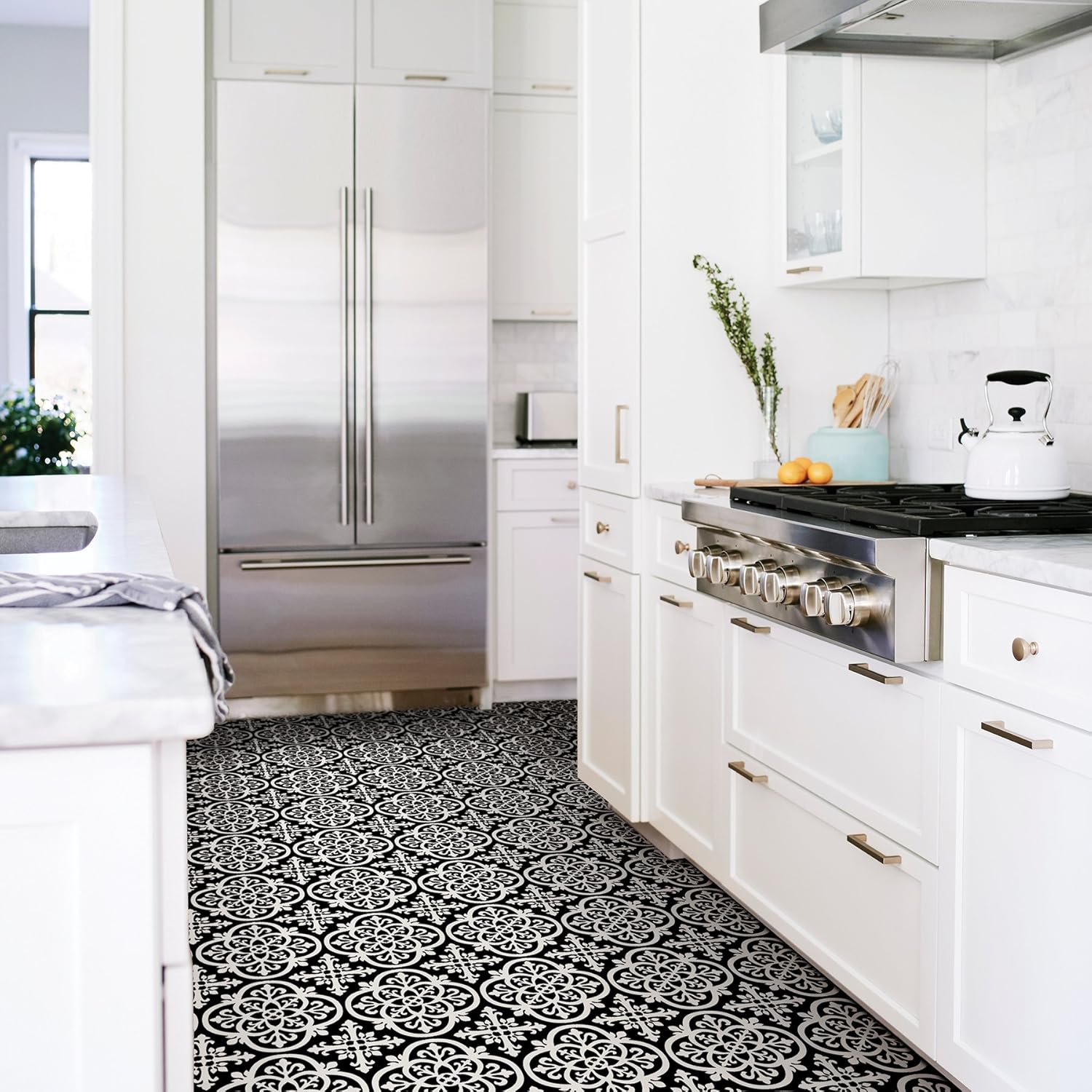 The gothic tiles from FloorPops stand out as a transformative solution for quick and stylish flooring upgrades. Within minutes, this product can refresh the look of any kitchen, bathroom, or laundry space, thanks to its intuitive peel stick design and bold black pattern.