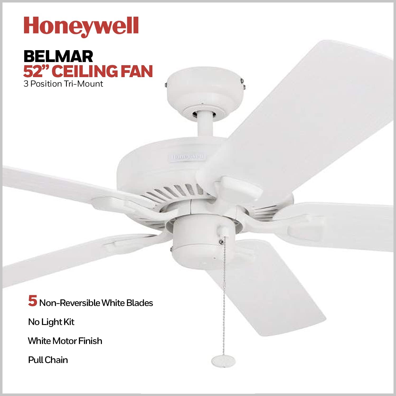 Upgrade your outdoor space with the Honeywell Ceiling Fans Belmar 52 Inch Ceiling Fan, a durable and stylish solution ideal for patios or porches. Featuring a traditional 5-blade design and wet-rated construction, this fan offers three quiet speeds and easy pull chain control for maximum convenience. Its versatile tri-mount system ensures effortless installation on standard or vaulted ceilings, while the high-capacity motor promises powerful airflow. Trust Honeywell for lasting performance and timeless appeal—perfect for any outdoor setting.
