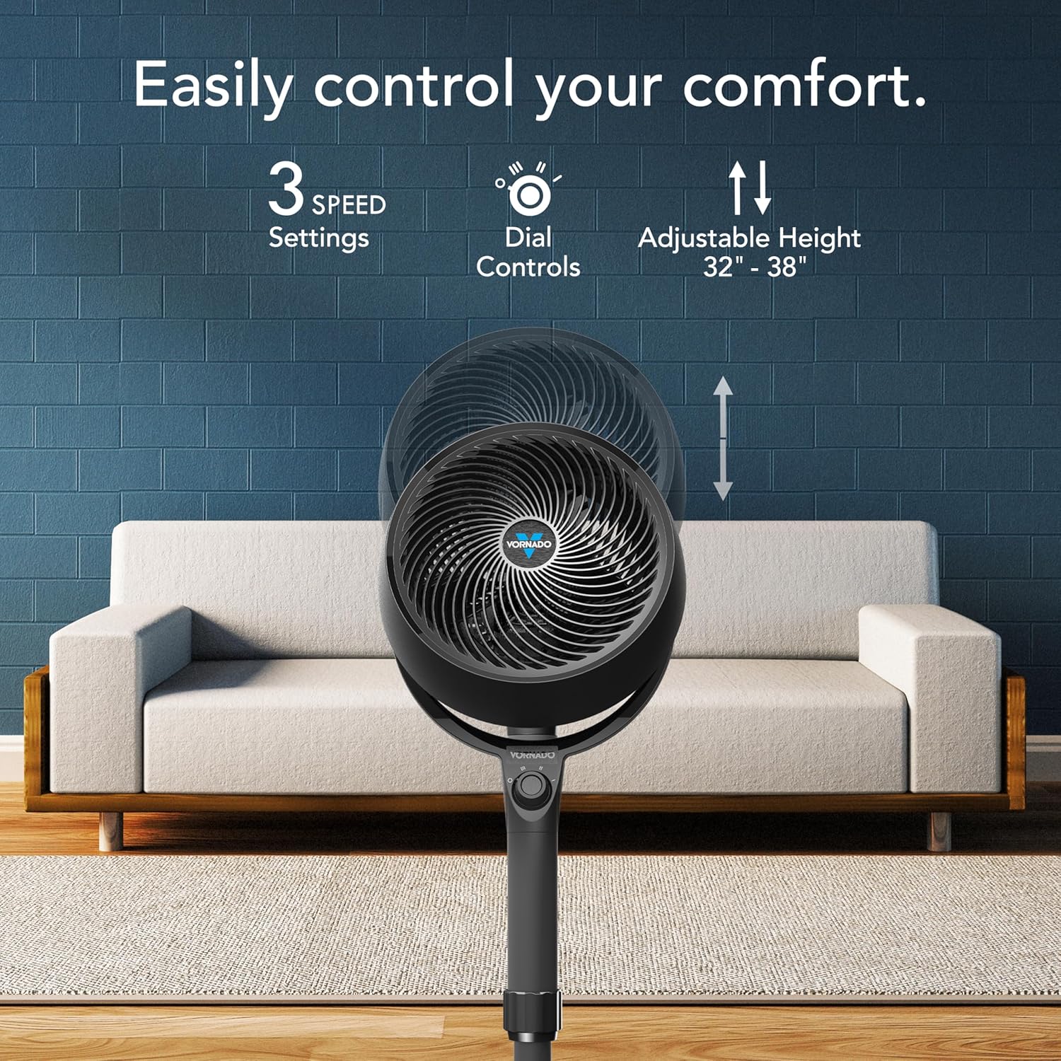 Vornado’s modern design makes it an appealing accent for any home or office. You get powerful airflow with 3-speed control, so you can personalize your environment exactly as you want it. Easy tool-free assembly lets you start enjoying premium air movement in just minutes, and the adjustable pedestal height ensures airflow is always directed where it’s needed.