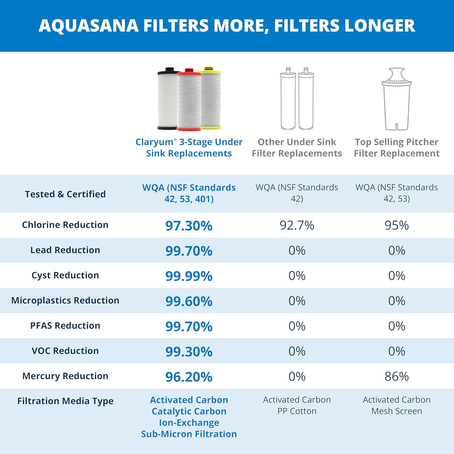 Third-party reviews praise the replacement filters for effectively reducing contaminants as claimed by the manufacturer. According to Aquasana, thorough testing shows certified removal of chlorine, lead, PFAS, and microplastics, with performance backed by WQA certification to NSF/ANSI 42, 53, and 401 standards. Installation is as simple as twist-off, replace, and twist-on, often taking less than 10 minutes.
