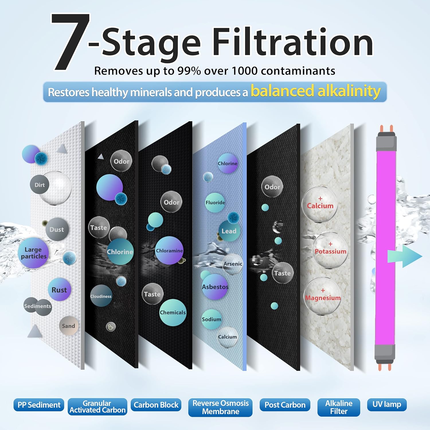 - 7-Stage Filtration System: Provides up to 99% contaminant reduction, combining sediment, carbon, and a robust RO membrane for comprehensive water purification.