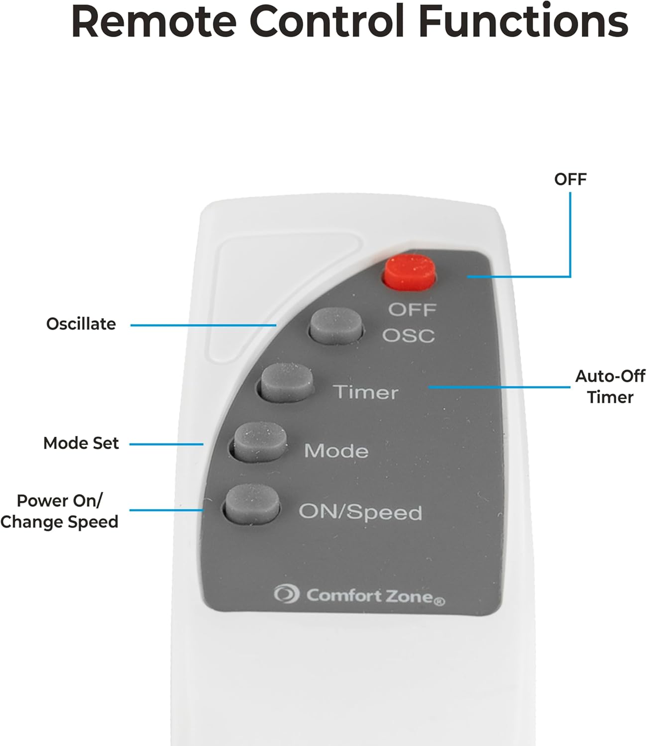The Comfort Zone 16-Inch Fan with Remote Control offers whisper-quiet, customizable cooling for any room, featuring 3 speeds, 90° oscillation, and convenient timer and sleep modes—all easily managed from across the room with the included remote. Its space-saving wall-mount design, durable metal safety grille, and modern white finish make it ideal for bedrooms, home gyms, offices, and more. ETL listed for safety and quality, this fan from Comfort Zone is the perfect blend of comfort, convenience, and reliability for your indoor spaces.
