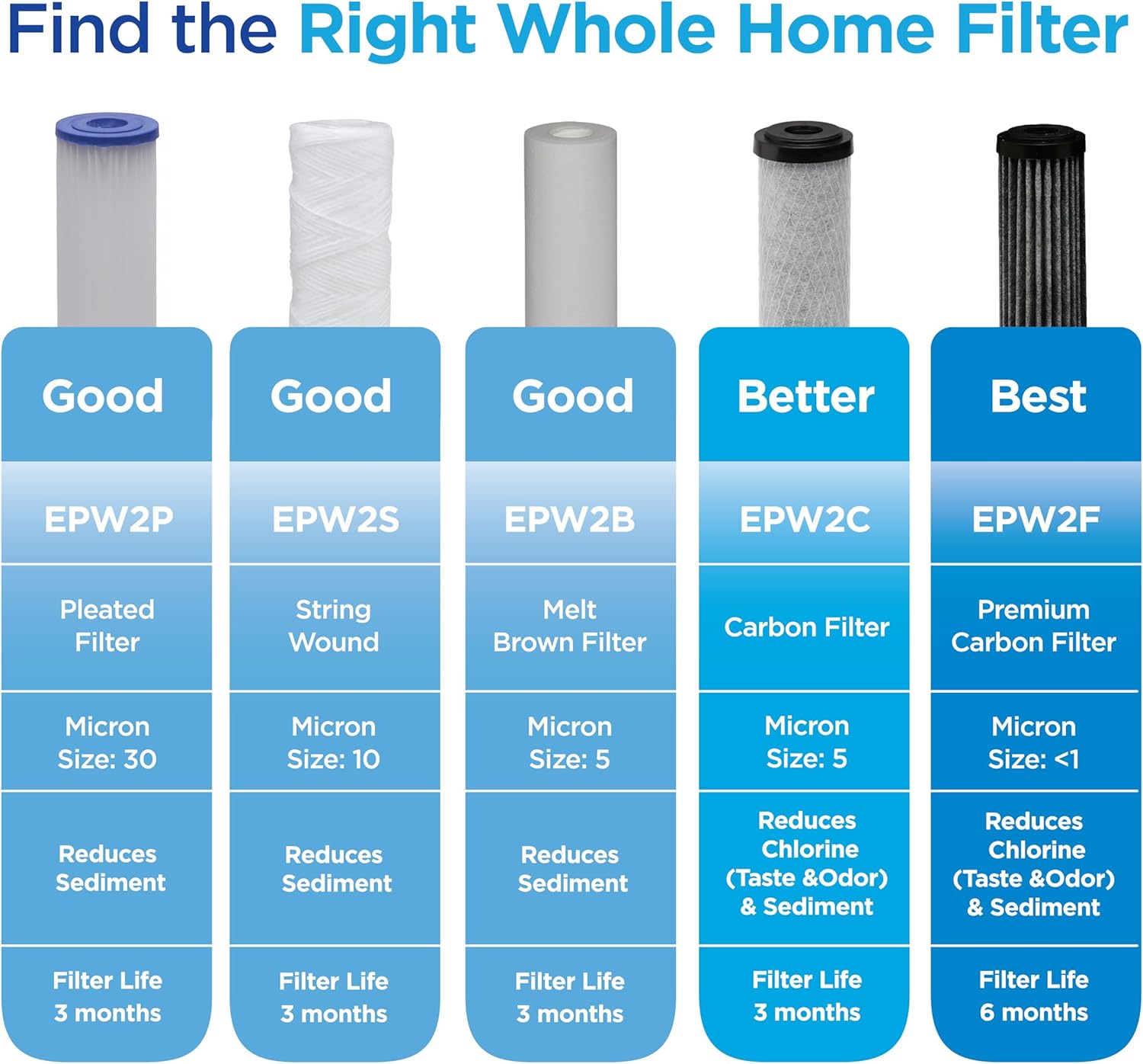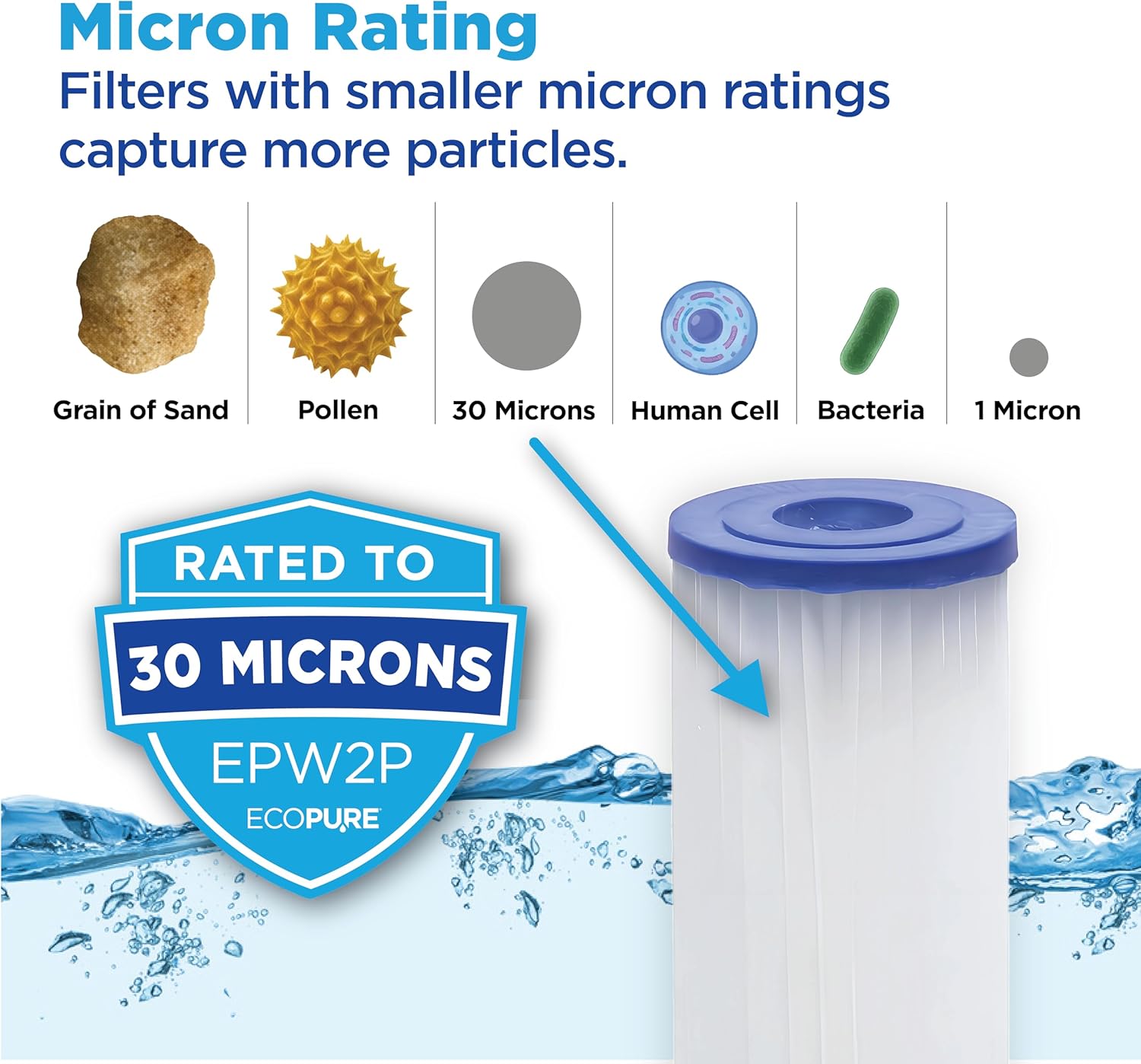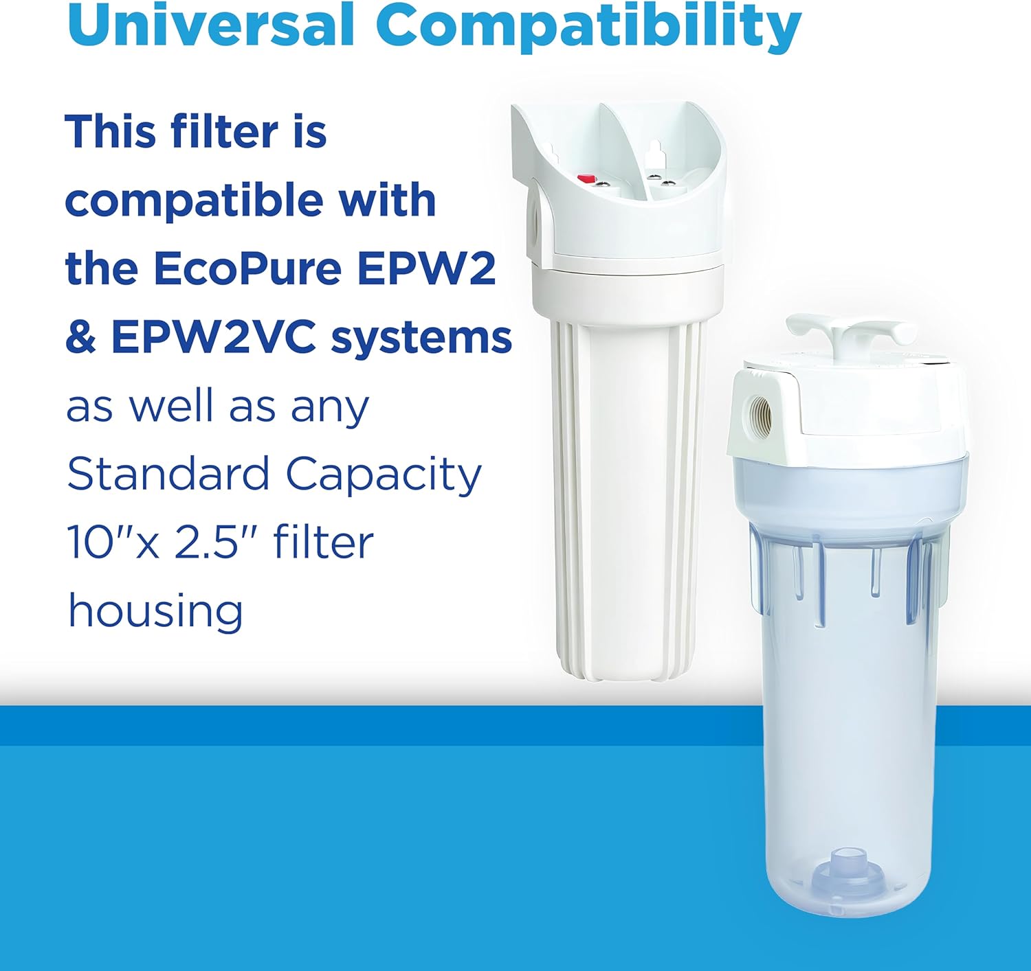 The EcoPure EPW2P Pleated Universal Whole Home Water Filter 2-Pack offers reliable, NSF certified 30-micron filtration to protect your plumbing and appliances from sediment, sand, dirt, and rust. Compatible with most standard capacity systems including brands like Whirlpool, GE, and Culligan, these filters are easy to install and maintain, each lasting up to 3 months. With two filters per pack, you get six months of clean, fresh water for your home at an affordable price. Trust the EcoPure brand for hassle-free, whole-home water protection.
