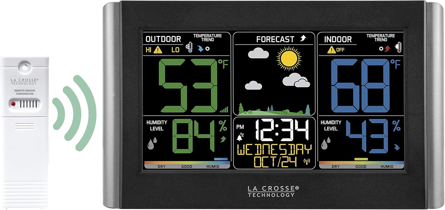 The weather station by La Crosse Technology continues to be a top contender in 2025 for homeowners who want detailed weather insights at a glance. This product sets itself apart with a vivid color display, indoor outdoor temperature and humidity monitor, and customizable alerts for maximum convenience.